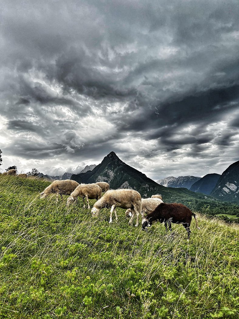 V našem tropu je okoli 170 živali, od tega 130 ovac avtohtone bovške pasme in 40 koz avtohtone drežniške pasme. Za družbo in njihovo varnost skrbi tornjaka Deks. Najnovejši član pasje druščine je avstralski kelpie Pix, ki nam pomaga pri paši oz. premikanju ovc na pašnike. Le-te se pasejo na pašnikih okoli kmetije, občasno tudi izven njih. Koze pa so že bolj izbirčne pri paši in si jo poiščejo same malo višje proti Rombonu.